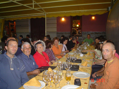 la gran cena del viernes antes de la marcha. de izquierda a derecha: Jose, Julio y señora, señoras de Miquel y Joan, señora de Goyo, Goyo, Joan Martí, Miquel, Manolo Sancho, Manolo Rasero e hijas, y yo en primer plano tapando a Francisco Yebra.(foto yolanda)