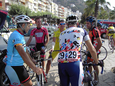 Antes de la salida, conversando con mi hermano Salva , Pedrito Soler y los campeones de Catalunya en línea Priego y de contrarreloj M.A.Cherino.(foto Xavi)