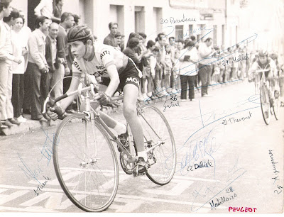 aquí en plena carrera intentándome escapar seguido de A. Moreno, esta foto también tiene algunos autógrafos, entre otros el de J. M Fuente, Parenteau, Mollet, Martellozzo, Delisle, Thevenet y Guitard.